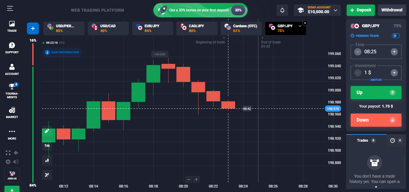 The main advantage is that you don’t have to invest large amounts to trade on the platform. You can simply start with a deposit of 10 US dollars.
